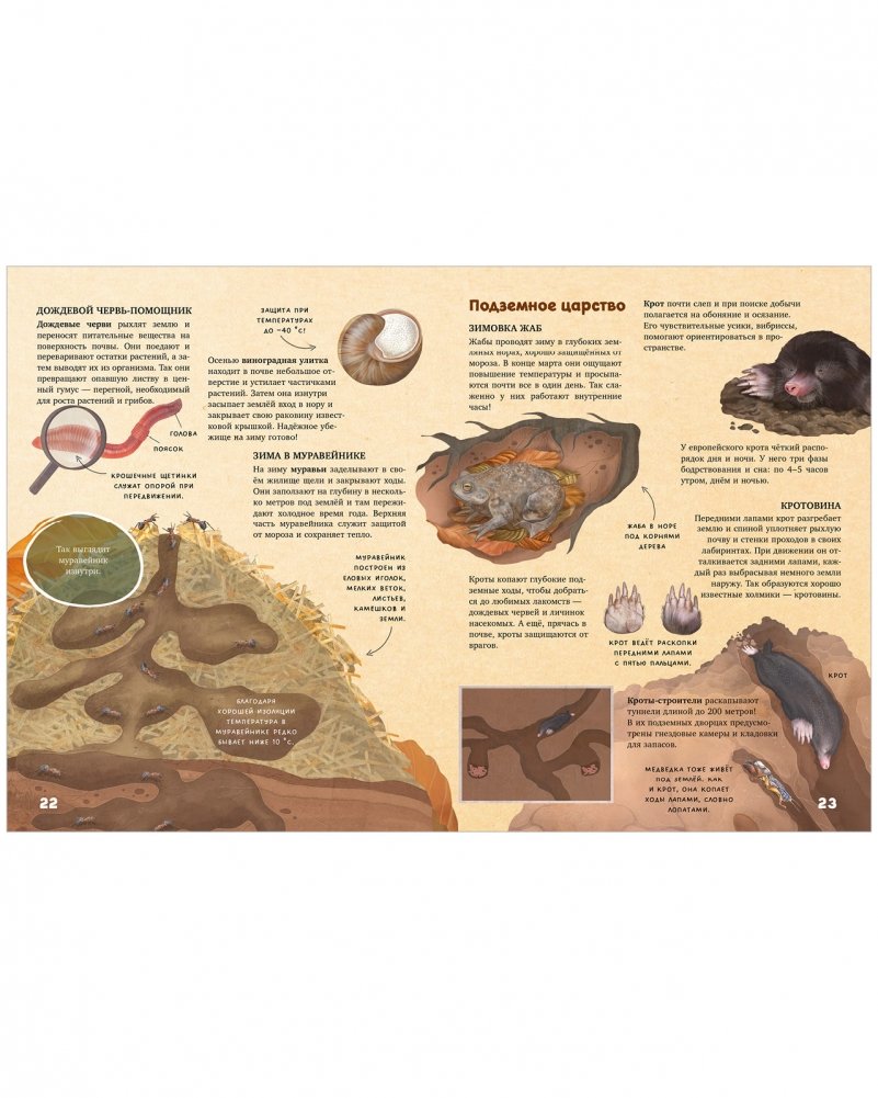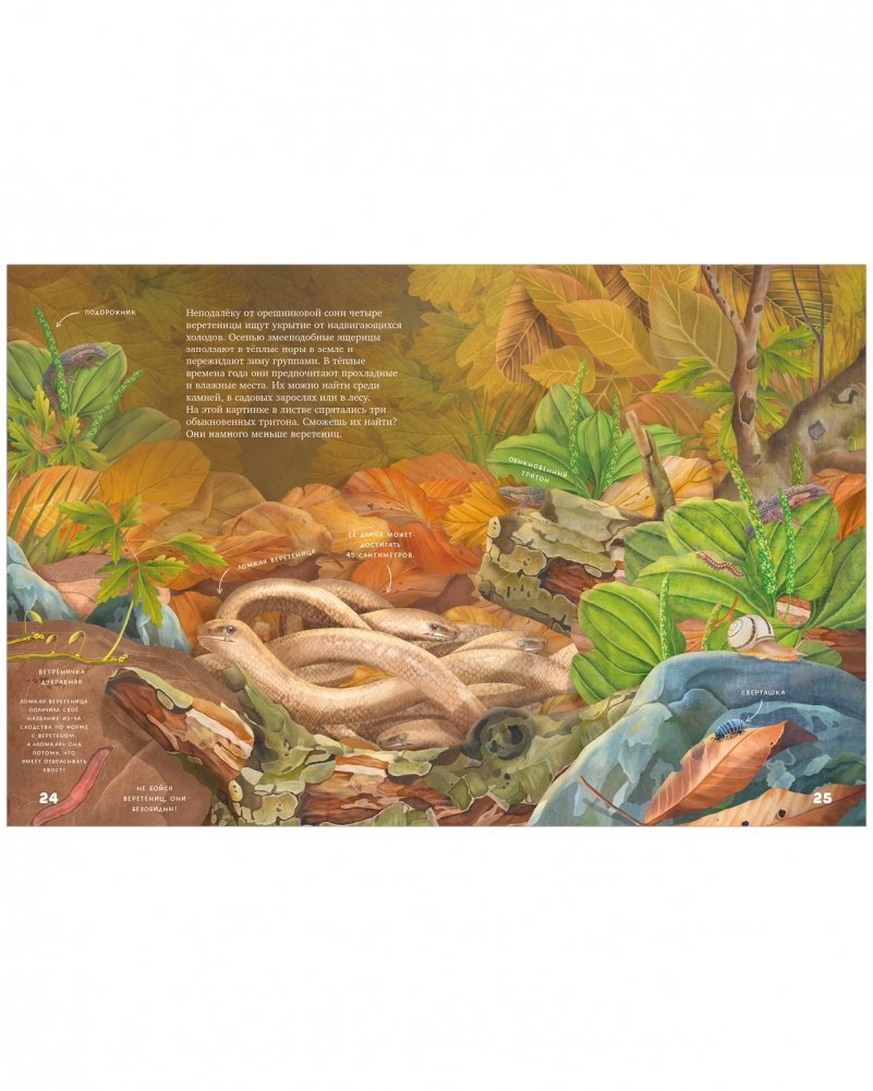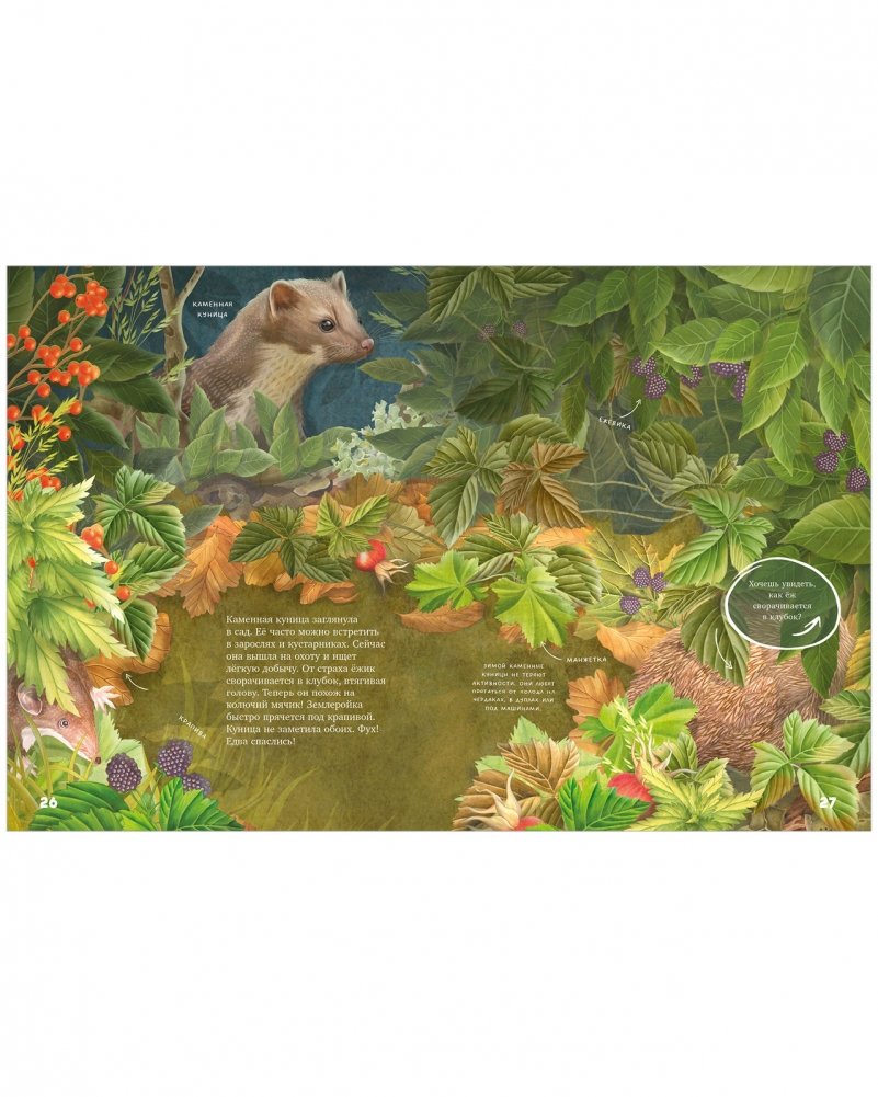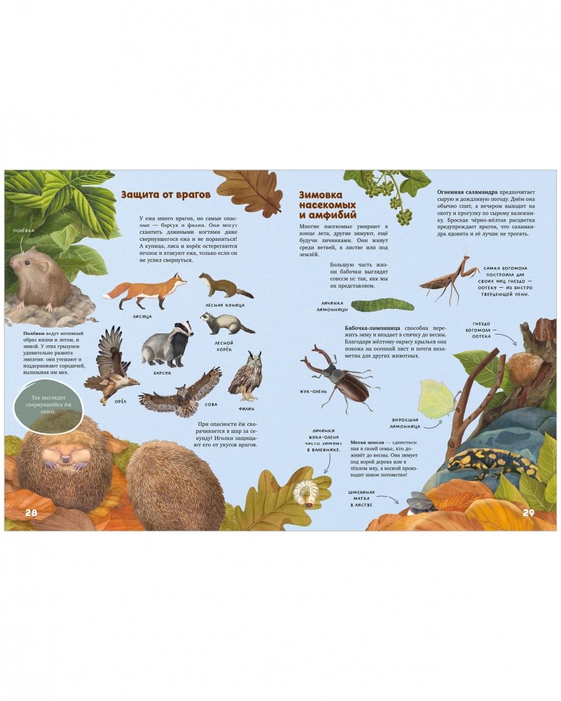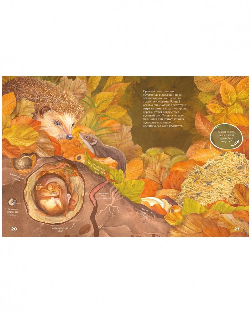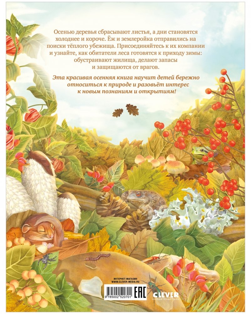 Осенью деревья сбрасывают листья, а дни становятся холоднее и короче. Еж и землеройка отправились на поиски теплого убежища. Присоединяйтесь к их компании, открывайте визуальную энциклопедию «Секреты осеннего леса» и узнайте, как обитатели леса готовятся к приходу зимы: обустраивают жилища, делают запасы и защищаются от врагов.