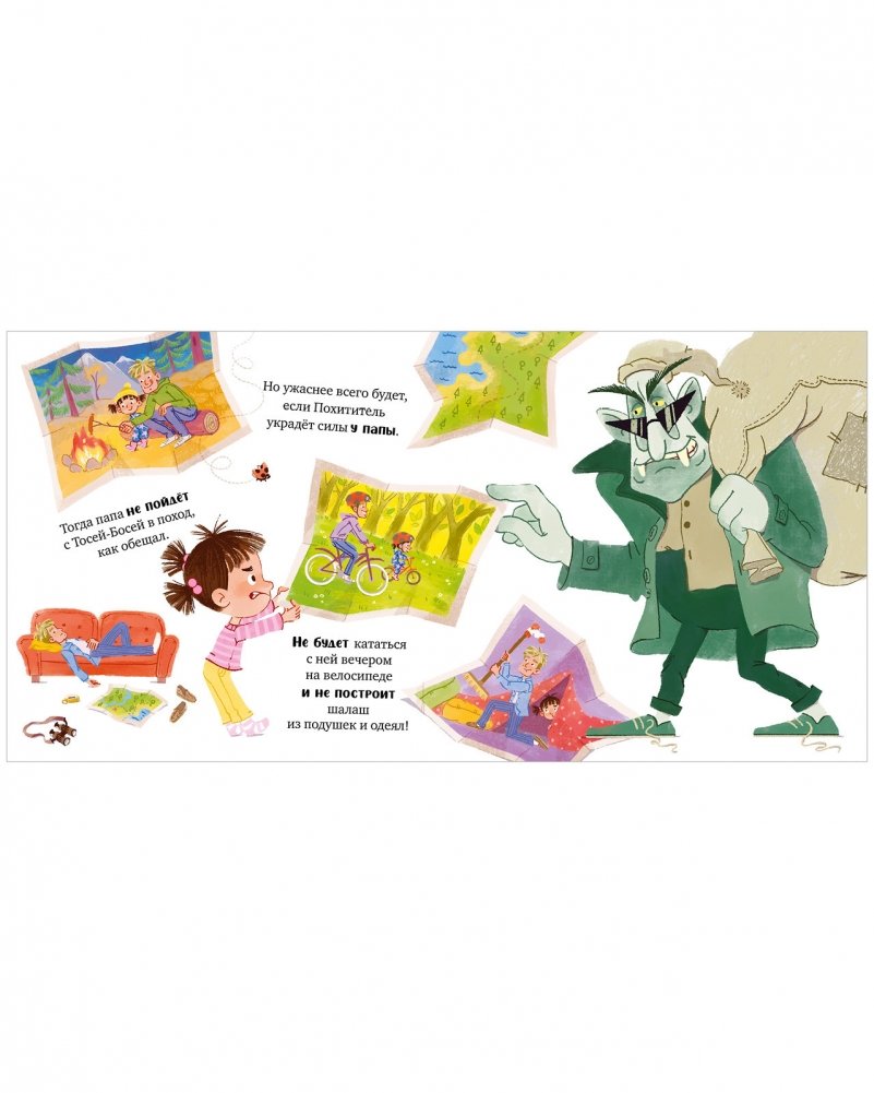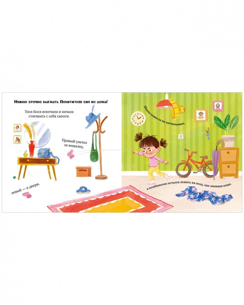 Тося-Бося может часами играть, бегать, летать с горки. Ее энергия неиссякаема… Но стоит Тосе-Босе подумать о мытье рук и чистке зубов, как ее силы вдруг пропадают. Кажется, во всем виноват коварный Похититель сил! Что, если он доберется до мамы и она не сможет печь блинчики из-за упадка сил? Или до папы? До бабушки? Тося-Бося полна решимости победить негодяя.