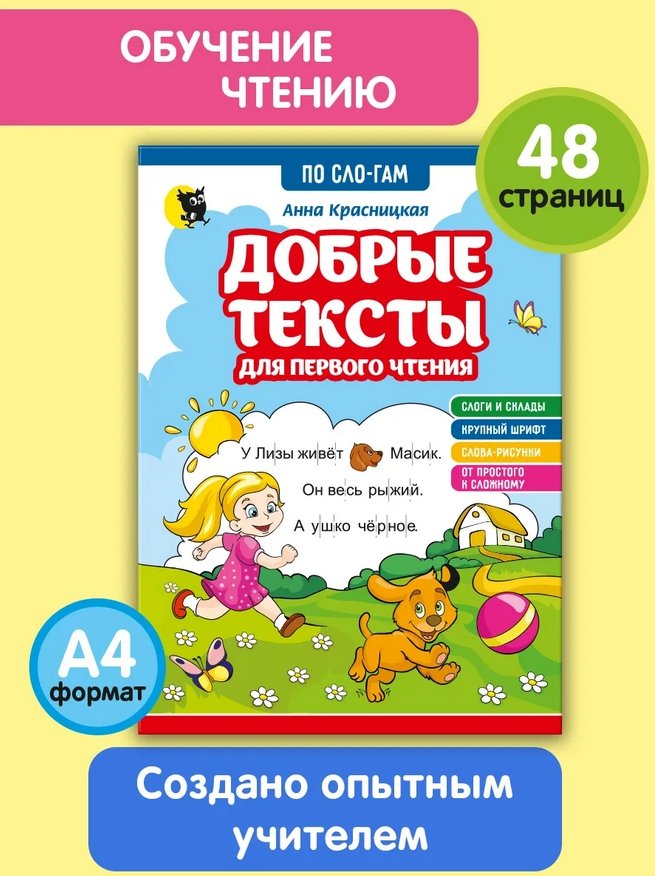 «Добрые тексты для первого чтения» — отличный вариант для самостоятельного чтения в послебукварный период. Особенно хорошо подойдёт ребятам, которые только-только научились читать.