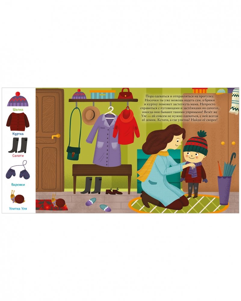 На каждом развороте маленьких читателей ждет яркая панорамная картинка, предметы для поиска, новые слова, знакомство с важными правилами и режимом дня. Играя в популярную и любимую всеми малышами 2-4 лет игру «найди и покажи», ребенок узнает, как важно умываться и чистить зубы, завтракать, гулять, вовремя ложиться спать. Читая вместе с милыми героями — мальчиком и его питомцем, забавной улиткой Улей, — короткие простые тексты, малыш все будет делать весело и по правилам.