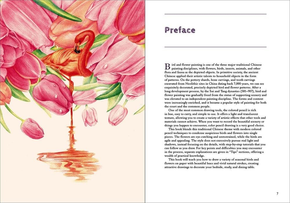 Drawing with colored pencils is an artistic technique that combines sketching and color, offering a lighter, more translucent texture. In the long history of Chinese art, birds and flowers have been a common theme in paintings. This book will teach you how to use vibrant colored pencils to depict birds and flowers with auspicious meanings, opening up a unique natural world. Through numerous tutorials comprising pictures and detailed explanations, you will be able to use the simplest drawing tools to create colorful, beautifully composed works of art.