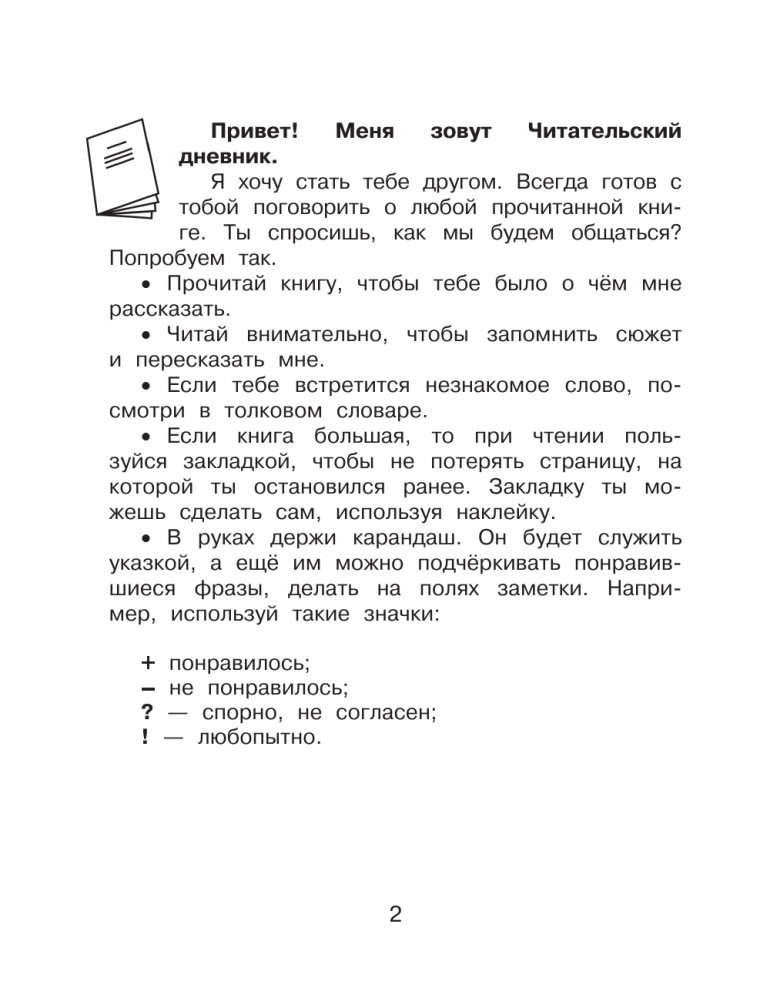 ДОРОГОЙ ДРУГ! У тебя в руках читательский дневник, который на целый год станет твоим настоящим другом. Ты взрослеешь и становишься профессиональным читателем. В этом тебе поможет этот дневник. Записывай в него всё, что ты прочитал, выполняй интересные задания, наклеивай цветные картинки, отгадывай загадки и ребусы. Всё это поможет лучше запомнить прочитанные произведения, научит их анализировать, правильно пересказывать, давать характеристики героям книг и даже немножко сочинять стихи и рассказы. Читательский дневник можно использовать как на уроках литературного чтения, так и дома, во время летних каникул.