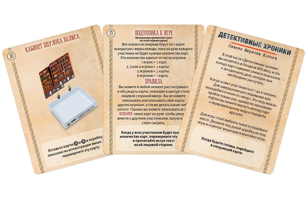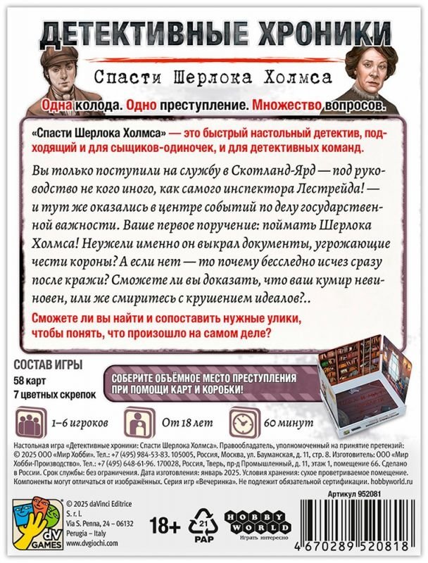 "Спасти Шерлока Холмса" – это быстрый настольный детектив, подходящий и для сыщиков-одиночек, и для детективных команд. Вы только поступили на службу в Скотланд-Ярд – под руководство не кого иного, как самого инспектора Лестрейда! – и тут же оказались в центре событий по делу государственной важности. Ваше первое поручение: поймать Шерлока Холмса! Неужели именно он выкрал документы, угрожающие чести короны? А если нет – то почему бесследно исчез сразу после кражи? Сможете ли вы доказать, что ваш кумир невиновен, или же смиритесь с крушением идеалов?..