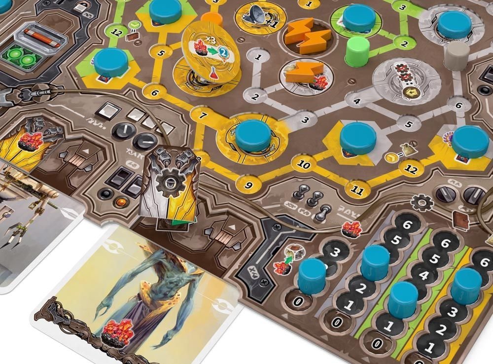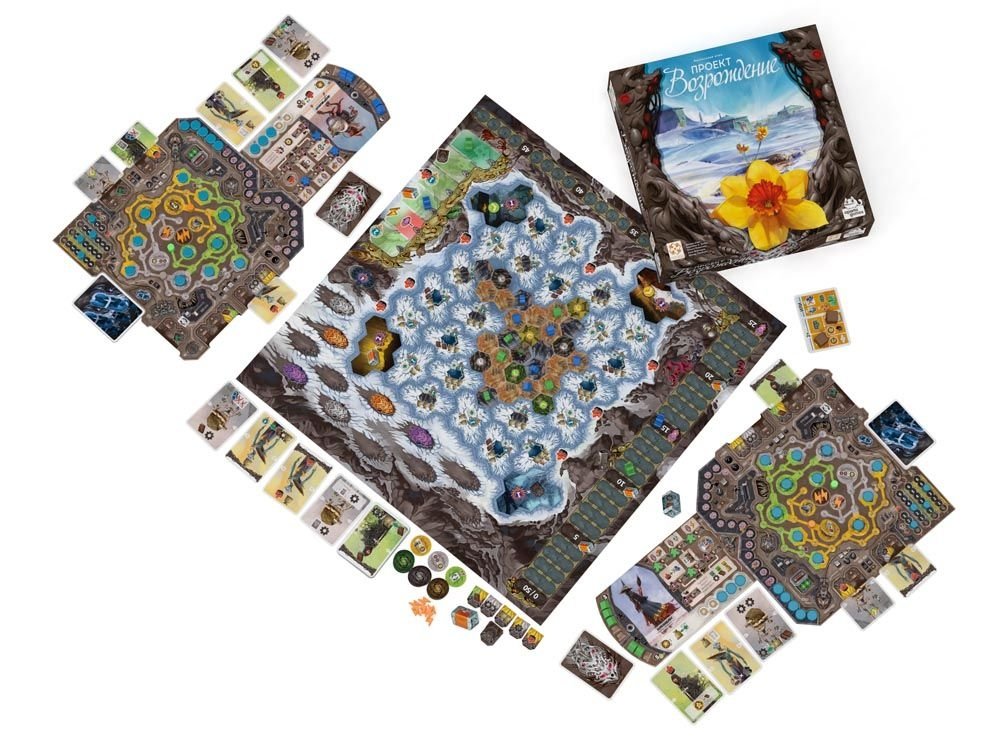 В состав настольной игры Проект «Возрождение» входит: игровое поле, 25 тайлов местности, 5 стартовых тайлов местности, 5 тайлов крупных локаций, 28 фишек энергии, 48 жетонов модулей, 30 жетонов механизмов, 28 жетонов контейнеров, 12 тайлов основных артефактов, 8 тайлов запасных артефактов.
