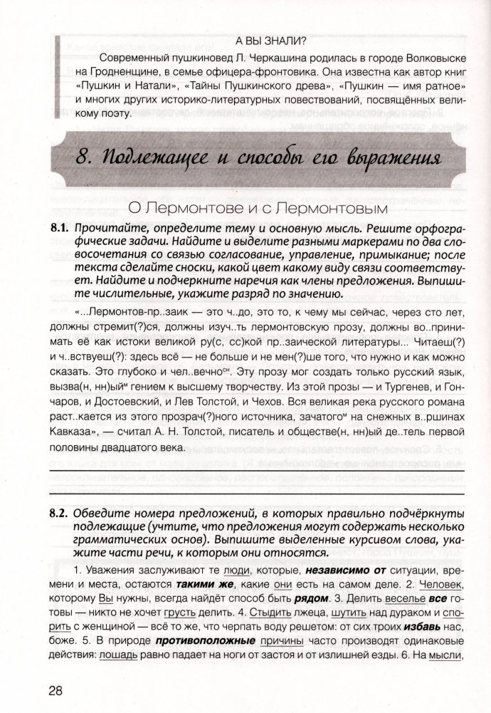 Практикум — часть учебно-методического комплекса по учебному предмету «Русский язык» в 8-м классе. Практикум содержит частично-поисковые, исследовательские и творческие задания, задания с элементами игровых технологий. Задания выстроены от простого к сложному, практический материал позволяет расширять и углублять знания учащихся не только по языку, но и по литературе, формировать и развивать личностные и метапредметные компетенции учащихся.