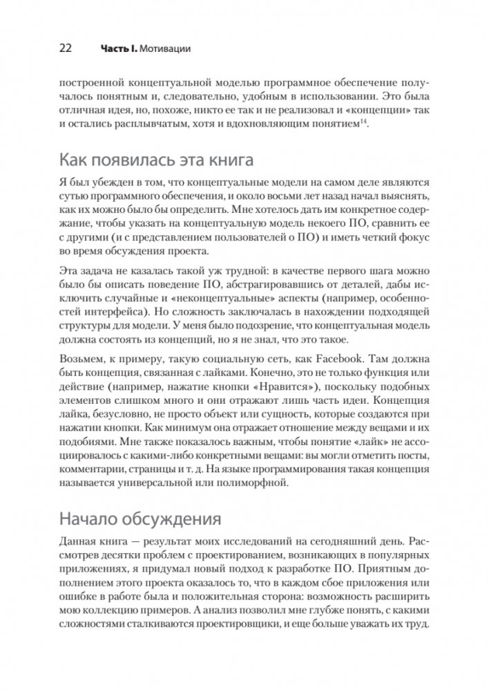 Вы узнаете, что такое концепции, как их идентифицировать, определять и применять на практике. Познакомитесь с принципами и получите практические рекомендации. Примеры реальных проектов ведущих айти-компаний показывают, как концепции помогают сохранять и повторно использовать знания о дизайне, избегая необходимости начинать с нуля в каждом новом проекте.