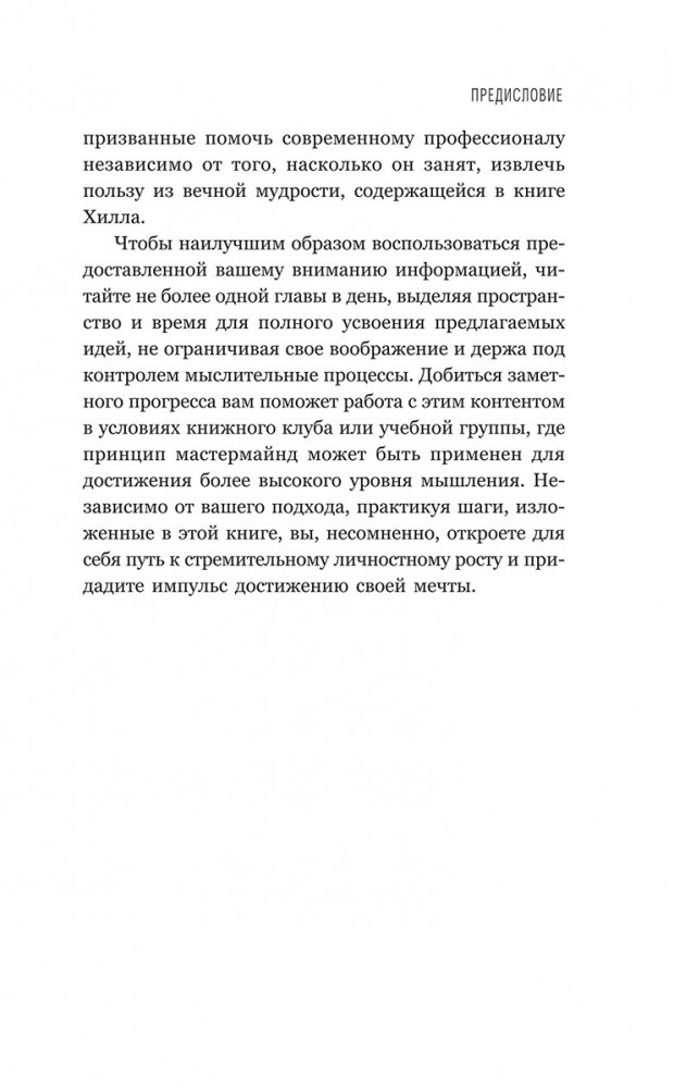 Книга представляет собой краткое изложение оригинального текста шедевра Наполеона Хилла 1937 года. В ней собраны ключевые принципы, рекомендации и примеры, чтобы современный профессионал тоже мог извлечь пользу из актуальной во все времена мудрости Хилла, открыв для себя путь к стремительному личностному росту и придав импульс воплощению своей мечты.