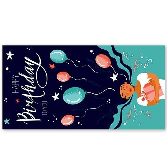 Конверт для денег «Happy Birthday. Вид 4» предназначен для поздравления с днём рождения. Конверт выполнен из мелованного картона с выборочным УФ-лакированием. Формат 85×162 мм.
