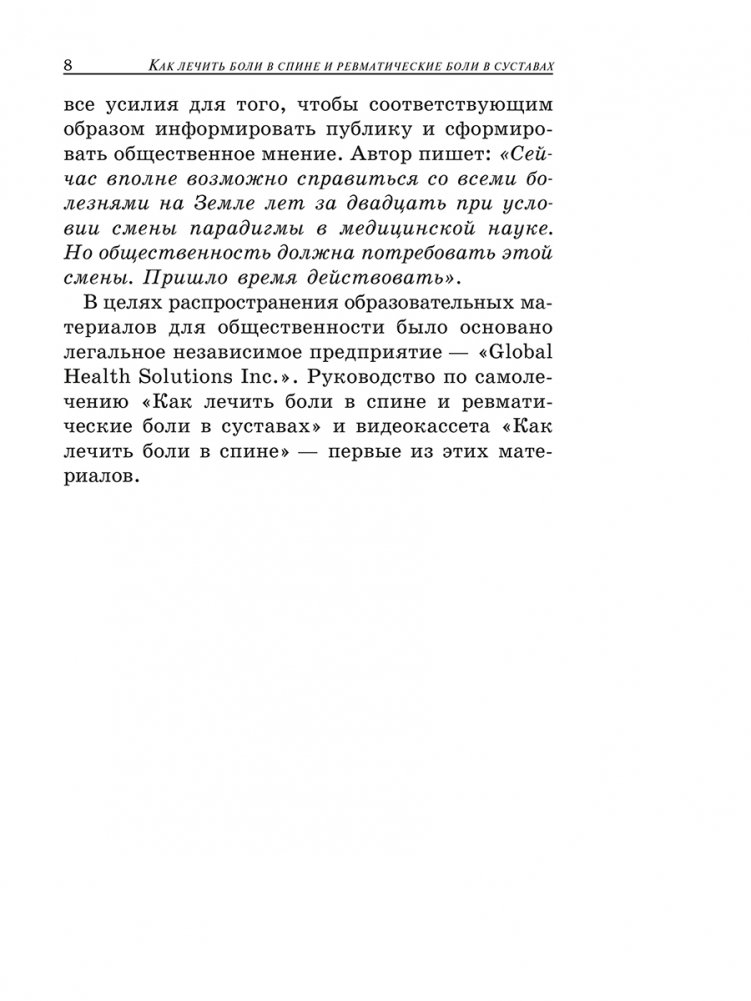Научные исследования доктора Батмангхелиджа показали, что так называемые хронические боли часто есть не что иное, как посылаемые организмом сигналы, указывающие на обезвоживание. В большинстве случаев боль можно ослабить с помощью обычной воды, но вместо этого людям прописывают дорогостоящие фармацевтические препараты. В этой книге рассматривается важная роль воды в работе механизмов, стабилизирующих позвоночник, а также подробно описан новый комплекс физических упражнений, позволяющих улучшить гидратацию межпозвоночных дисков, вправить смещенные диски и быстро избавиться от боли.