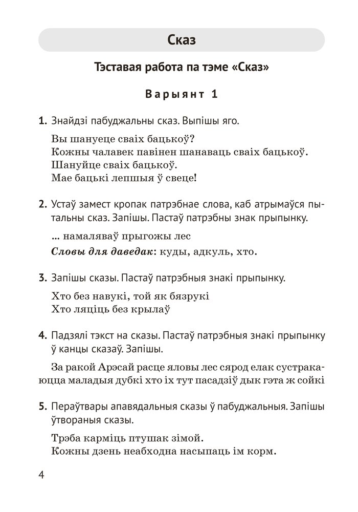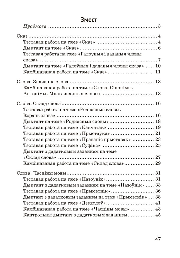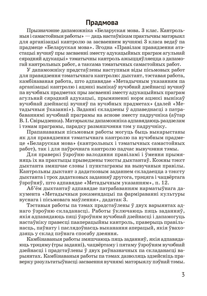 Дапаможнік змяшчае матэрыялы для арганізацыі кантрольна-ацэначнай дзейнасці вучняў 3 класа: тэставыя і камбінаваныя работы, дыктанты. Прапанаваныя заданні могуць быць выкарыстаны для правядзення кантрольных работ або падчас вывучэння тэмы.
