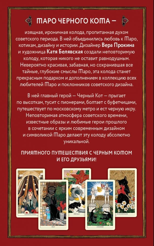 Очень стильная, яркая, ироничная колода, вдохновленная советским дизайном. В ней сочетается любовь к котикам, дизайну, истории и таро. Художница Екатерина Белявская и дизайнер Вера Прокина создали неповторимую коллекционную колоду таро для тонких ценителей дизайнерских вещей. Главный герой колоды- легендарный Черный кот, который тусит с пионерами, болтает с буфетчицами, ест черную икру и путешествует по московскому метро. Неповторимая атмосфера, ирония, великолепные иллюстрации в сочетании с символикой Таро Уэйта делает эту колоду абсолютно уникальной.