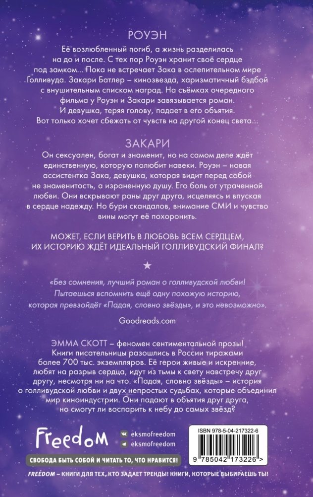 Ее возлюбленный погиб, а жизнь разделилась на "до" и "после". С тех пор Роуэн хранит свое сердце под замком... Пока не встречает Зака в ослепительном мире Голливуда. Закари Батлер – кинозвезда, харизматичный бэдбой с внушительным списком наград. На съемках очередного фильма у Роуэн и Закари завязывается роман. И девушка, теряя голову, падает в его объятия.