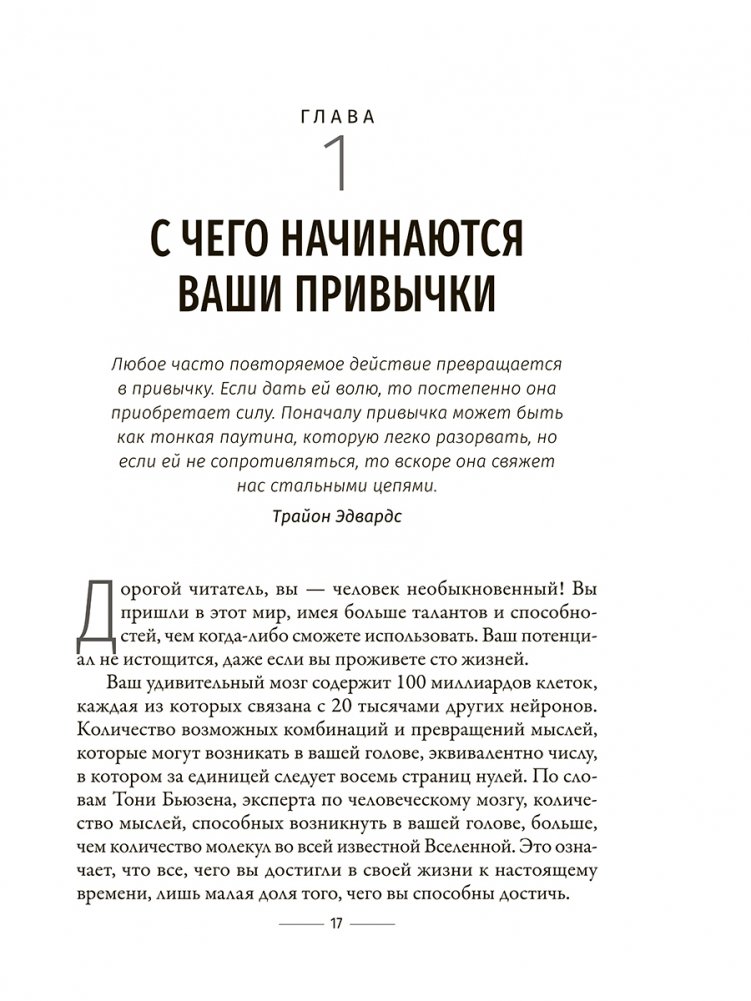 Наши мысли, наши чувства и наши поступки на 95 процентов предопределяются нашими привычками. Привычки имеют глубокие корни, но мы способны их изменить: отжившие свое и ставшие вредными привычки можно заменить новыми, полезными — и это сразу же принесет свои плоды.
