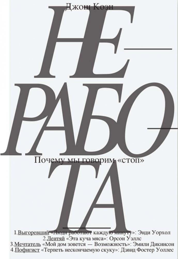 Книга британского психоаналитика Джоша Коэна посвящена нашим отношениям с трудом, точнее — заложенному в каждом из нас желанию не работать, которое отнюдь не безоблачно сосуществует с желанием работать — и добиваться успеха, престижа, благополучия, — причем, как полагает автор, является не менее, а возможно, и более важным, даже определяющим для человека. Это желание знакомо нам с детства, когда оно с легкостью удовлетворяется, но мы учимся подавлять его и привыкаем отдавать все силы работе, порой забывая, что жизнь ею не исчерпывается. Иногда результатом становятся большие достижения в избранной нами профессии, иногда — депрессия, иногда то и другое вместе. Как быть с потребностью в «неработе», которую невозможно реализовать в полной мере, но и отрицать, залавливать в себе, крайне опасно? Автор ищет подступы к ответу на этот, должно быть, неразрешимый вопрос в собственном жизненном опыте, в историях своих пациентов и в судьбах нескольких выдающихся людей, столкнувшихся с конфликтом между работой и «неработой» вплотную, — Эмили Дикинсон, Орсона Уэллса, Энди Уорхола и Дэвида Фостера Уоллеса. Из автобиографических очерков, заметок психоаналитика и тонких наблюдений о природе творчества складывается этот текст, продиктованный стремлением Джоша Коэна разобраться в себе и способный помочь в этом нам.