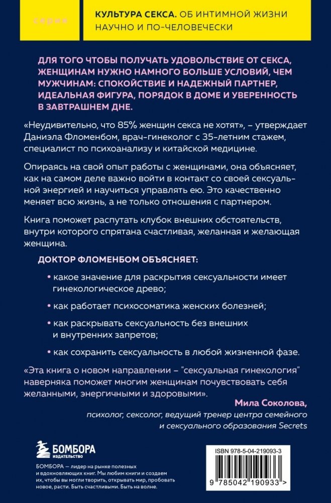 Что влияет на женское сексуальное удовлетворение? Почему женщины намного реже мужчин получают удовольствие от секса? На эти и множество других вопросов отвечает в своей книге врач-гинеколог с 35-летним стажем, специалист по психоанализу и китайской медицине Даниэла Фломенбом. Книга объясняет, как родительское воспитание влияет на становление будущей сексуальной жизни женщины, как знание своего гинекологического древа может упростить процесс принятия своей сексуальности и не повторять ошибок прошлых поколений. И, наконец, как забыв о своих страхах и запретах, почувствовать возбуждение и в полной мере получить удовольствие от секса. Ведь, по мнению автора, секс – это возвышенный процесс, переход в другое измерение, он помогает нам расти и познавать мир за границами своего "я". Даниэла Фломенбом делится своими знаниями, опытом и дает практические советы для того, чтобы женщинам было проще понять истинную причину неудовлетворенности и наконец "открыться и впустить в себя".