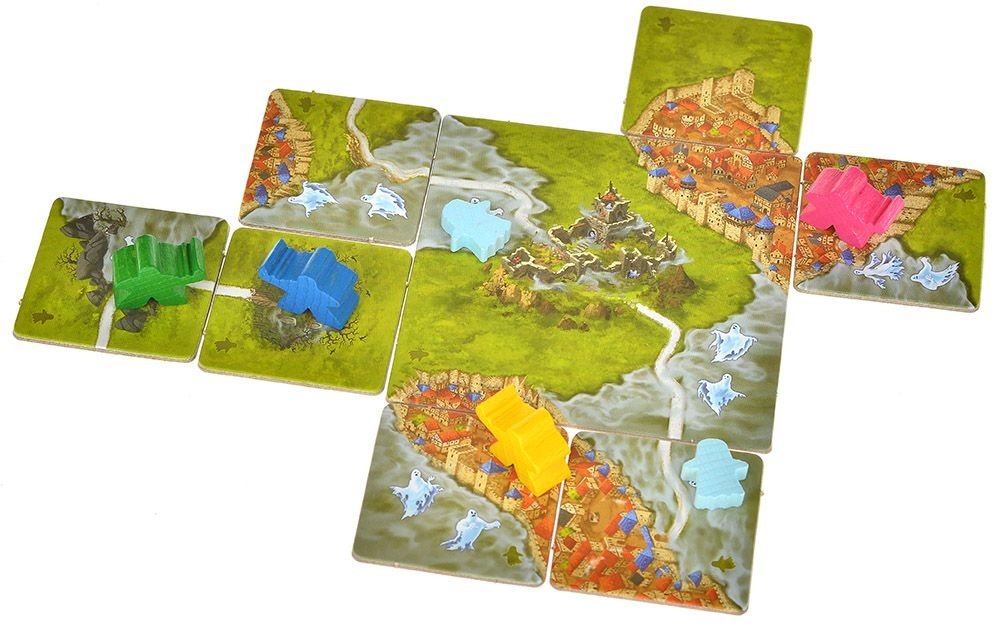 Если у вас есть базовая игра "Каркассон", можете совмещать с ней "Каркассон: Туманы и призраки", используя как дополнение, состоящее из трёх модулей. Вы можете вводить его в игру полностью или частично.