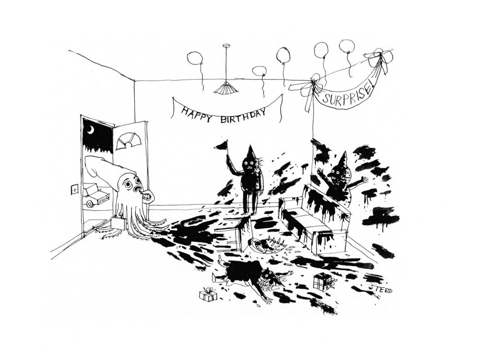 One swing trapeze artist prepares to receive a newborn child from another all the while shrieking “Support the head!” A hopeful, naked Adam reaches high for the largest leaf while a frustrated Eve hands him a smaller, more-appropriately sized leaf. A dejected squid stands in a doorway, shock and dismay on his face, as a ruined surprise party lies in wait before him―guests, presents, and birthday cake covered in a blast of ink in mid-“Sur…” as loose balloons butt against the ceiling.