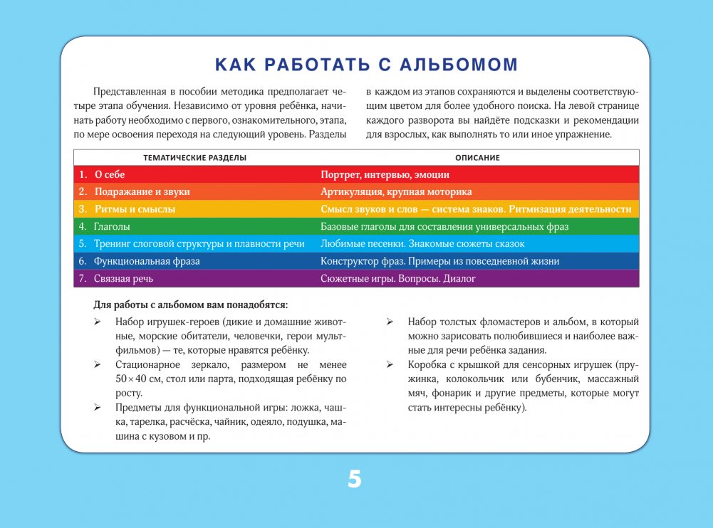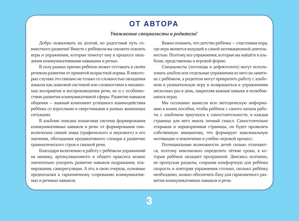 Альбом поможет ребёнку освоить речь и навыки общения через простые и эффективные игровые задания. Методика включает развитие артикуляционной моторики, имитации, саморегуляции, что важно для формирования фразовой речи и понимания. Упражнения построены по уровням сложности и сопровождаются подсказками для взрослого. Подходит детям с разным уровнем речевого развития, в том числе с РАС. Рекомендован логопедам, дефектологам и родителям для занятий в любом удобном ритме.