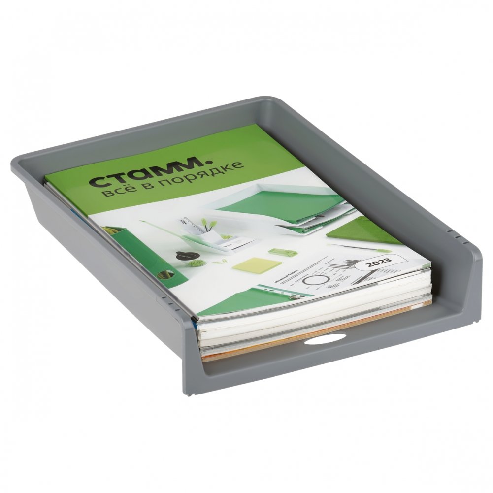 Лоток горизонтальный "СТАММ" серии "Базис" предназначен для хранения бумажной продукции формата А4. Лёгкий, прочный и устойчивый корпус имеет комбинированную поверхность — глянцевую и матовую. Предусмотрена возможность установки одного лотка на другой. Изделие высотой , глубиной и шириной вмещает до 400 листов. Индивидуальная упаковка - пакет. Цвет - серый.