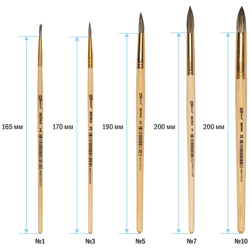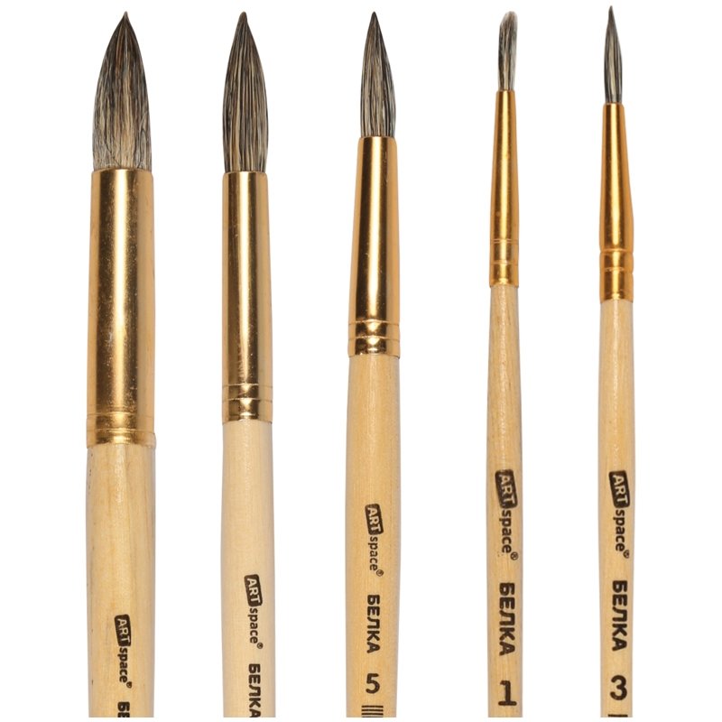 Художественные кисти ArtSpace изготовлены из волоса белки. Они хорошо впитывают, удерживают и отдают краску. Изделия подойдут для работы с акварелью, гуашью, темперой, водополимерными материалами. Кисти позволят протестировать вариативные мазки и расширят возможности в процессе создания картины.