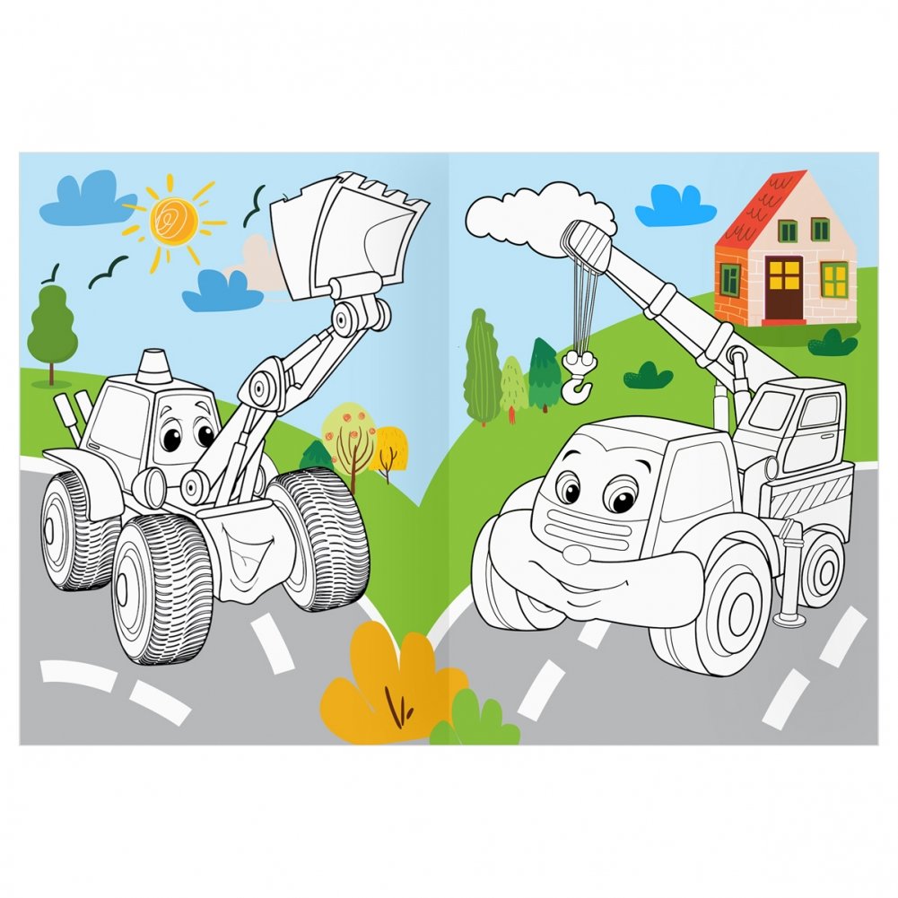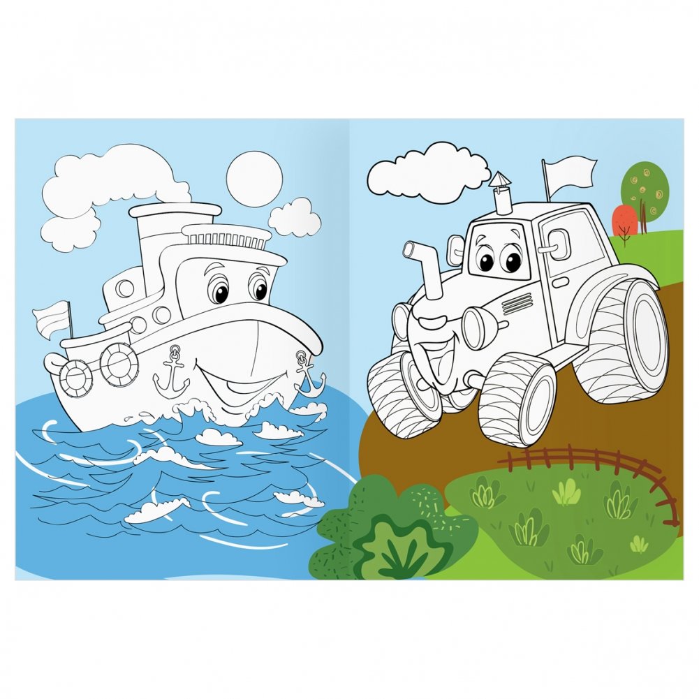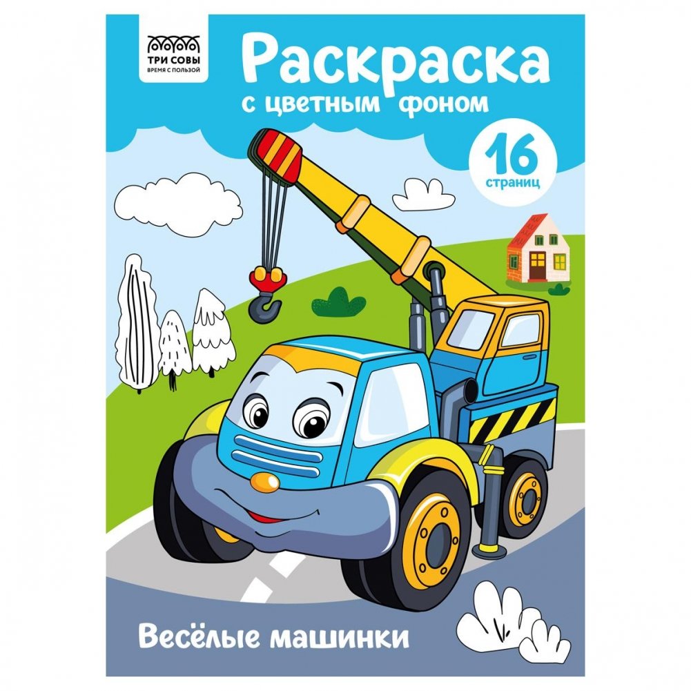 Раскраска с цв. фоном А4, 16 стр., ТРИ СОВЫ "Веселые машинки"