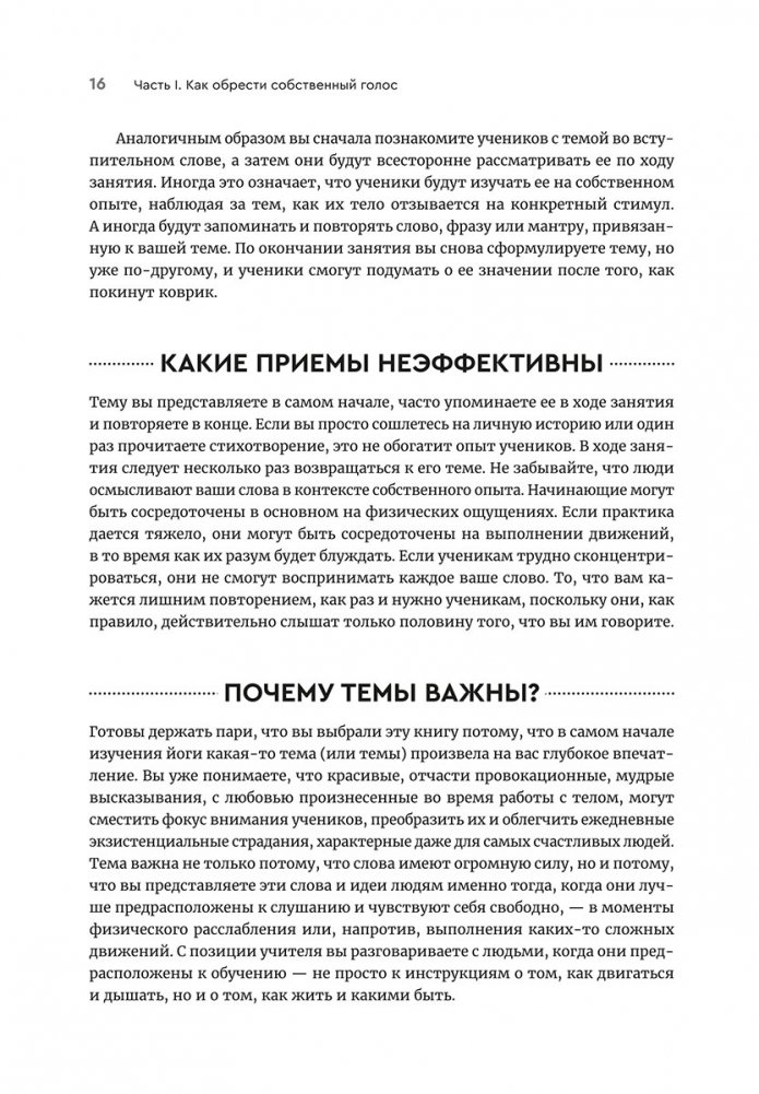 Это руководство будет полезно учителям, инструкторам и тем, кто занимается йогой самостоятельно и хочет поднять свои тренировки на новый уровень. Оно начинается с части, посвященной голосу, аутентичности, манере подачи материала, практике, повторению и источникам вдохновения. За ней следует вторая часть, где предлагается более 50 готовых тем, которые вы можете положить в основу своих занятий. В последней части приводятся шаблоны для создания ваших тем и записи идей.