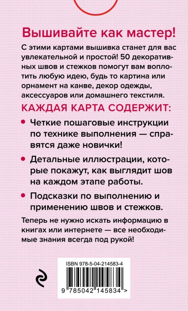 Освойте искусство декоративной вышивки с набором из 50 уникальных карт! Каждая карта демонстрирует один шов или стежок, сопровождаемый пошаговыми инструкциями и иллюстрациями, которые делают процесс вышивания простым и понятным. Этот набор станет настольным для тех, кто хочет сделать свои проекты изысканными и уникальными или попробовать что-то новое в вышивке. Вы научитесь вышивать красивые картины и орнаменты, декор для одежды, аксессуаров и текстиля. Карты удобно использовать как дома, так и в дороге — все необходимые техники всегда под рукой. Благодаря понятным пояснениям и советам, они пригодятся как новичкам, так и опытным мастерам. Отличный подарок творческому человеку! Раскройте свой творческий потенциал и вышивайте настоящие шедевры, вдохновляясь этой коллекцией!
