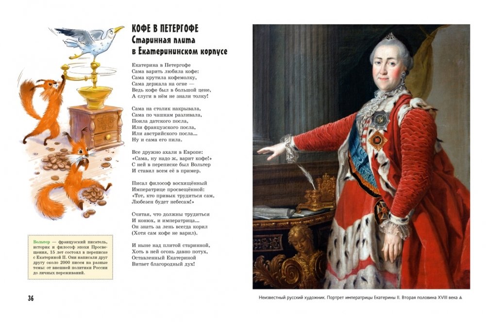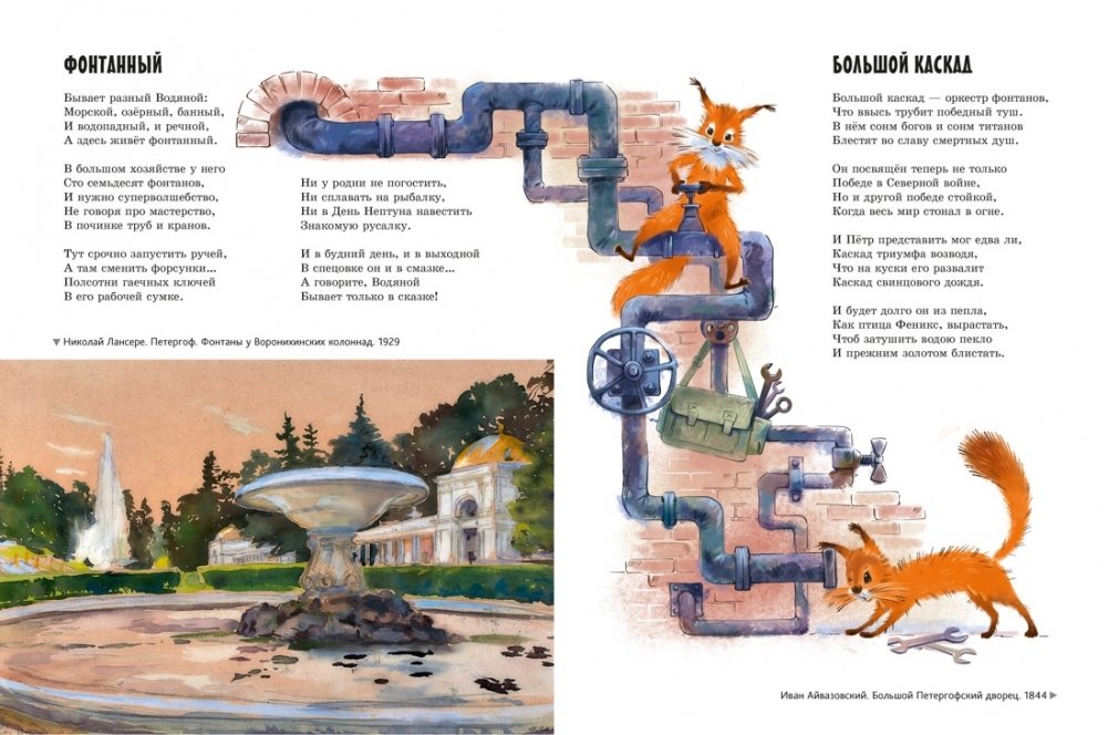 Ура, мы едем в Петергоф — знаменитую столицу дворцов и фонтанов! Скорее прыгайте в «Метеор» или «Ласточку»! Вы прогуляетесь по тенистым аллеям Верхнего сада и Нижнего парка, заглянете в будуар императрицы, узнаете, почему Екатерина II сама варила кофе, увидите картины значимых морских сражений Петровской эпохи, но это ещё не всё! Вы сможете покормить дрессированную рыбу в пруду у дворца «Марли», посидеть на самом настоящем царском троне и, конечно, искупаться в фонтанах-шутихах! А местные озорные белочки Петергоша и Петерглаша будут прыгать со страницы на страницу, приглашая вас заглянуть ещё и в Ораниенбаум и парк Александрия!
