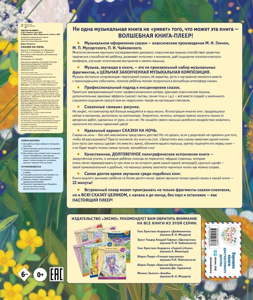 Сборник сказок современного отечественного автора для малышей и их родителей: добрые истории о дружбе, заботе, внимании, которые так приятно читать перед сном. Каждая строчка книги-аудиоспектакля сопровождается замечательной музыкой П. И. Чайковского, М. П. Мусоргского, М. И. Глинки, А. Н. Скрябина, А. С. Аренского.
