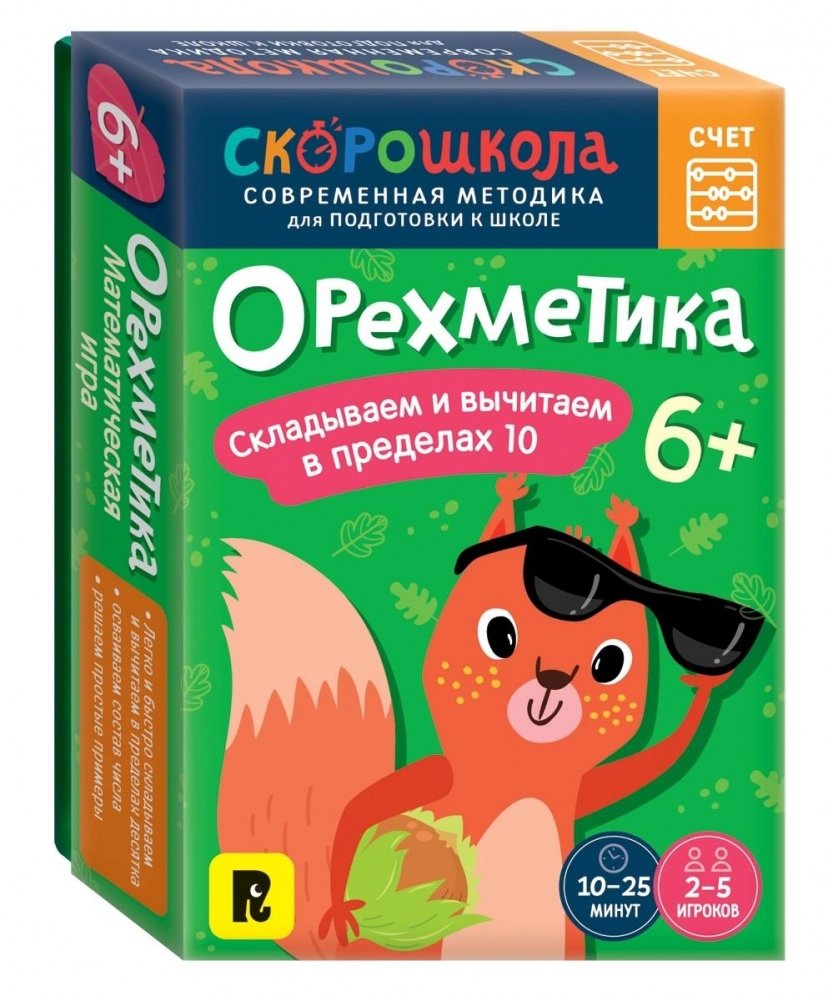 «Орехметика» — захватывающая математическая игра, которая научит складывать и вычитать в пределах 10, поможет освоить состав числа, а еще весело провести время с друзьями! Считая орешки и помогая белочкам, ребенок научится легко и быстро складывать, вычитать в пределах десятка, сможет решать простые примеры, хорошо освоит состав числа. Автор игры — Анастасия Никифорова — клинический психолог, детский нейропсихолог, специалист по диагностике и коррекции трудностей обучения. В наборе 70 карточек, 30 жетонов и 3 варианта игры для всей семьи.