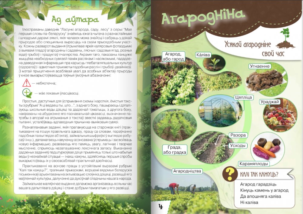 Ілюстраваны даведнік “Ласункі агарода, саду, лесу” з серыі “Мае першыя словы па-беларуску” знаёміць юнага чытача з разнастайнымі і шчодрымі дарамі зямлі, якія чалавек можа знайсці і сабраць у дзікай прыродзе або спецыяльна вырасціць на сваім прысядзібным участку. Кожны разварот выдання ўтрымлівае яркія каляровыя фотаздымкі з выявамі пладоў гародніны і садавіны, лясных і садовых ягад, розных відаў грыбоў і прадуктаў пчалярства. Акрамя таго, паказаны ланцужкі жыццёва неабходных сувязей паміж раслінамі і насякомымі, пададзена даведачная інфармацыя пра карысць глебапаляпшальных культур (сідэратаў) і адметныя прыкметы падобных раслін і грыбоў-двайнікоў.