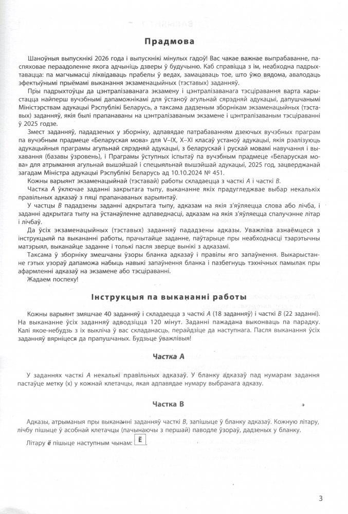 Зборнік тэстаў змяшчае экзаменацыйныя (тэставыя) заданні па беларускай мове, прапанаваныя ўдзельнікам цэнтралізаванага экзамену і цэнтралізаванага тэсціравання ў 2025 годзе. Да ўсіх заданняў пададзены адказы.