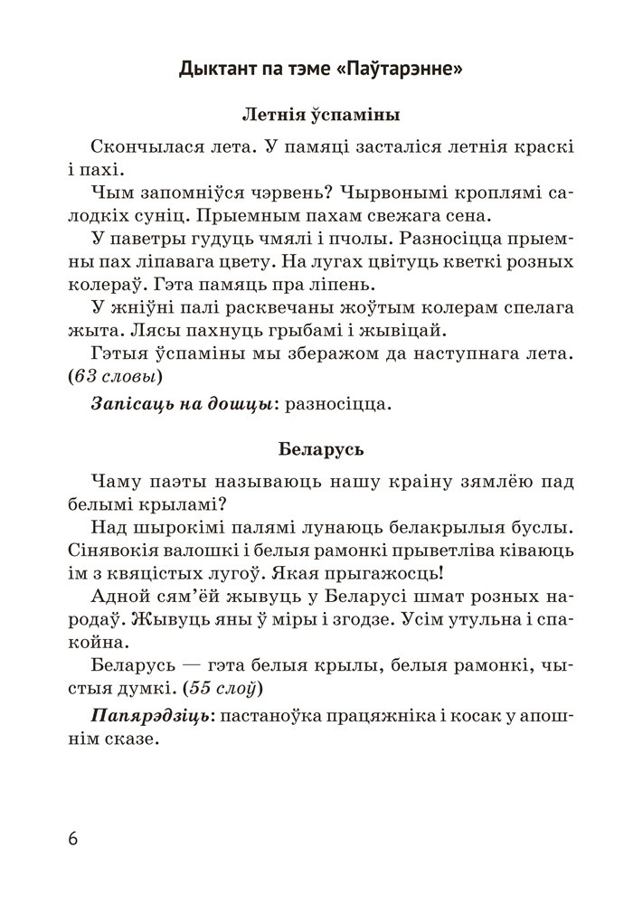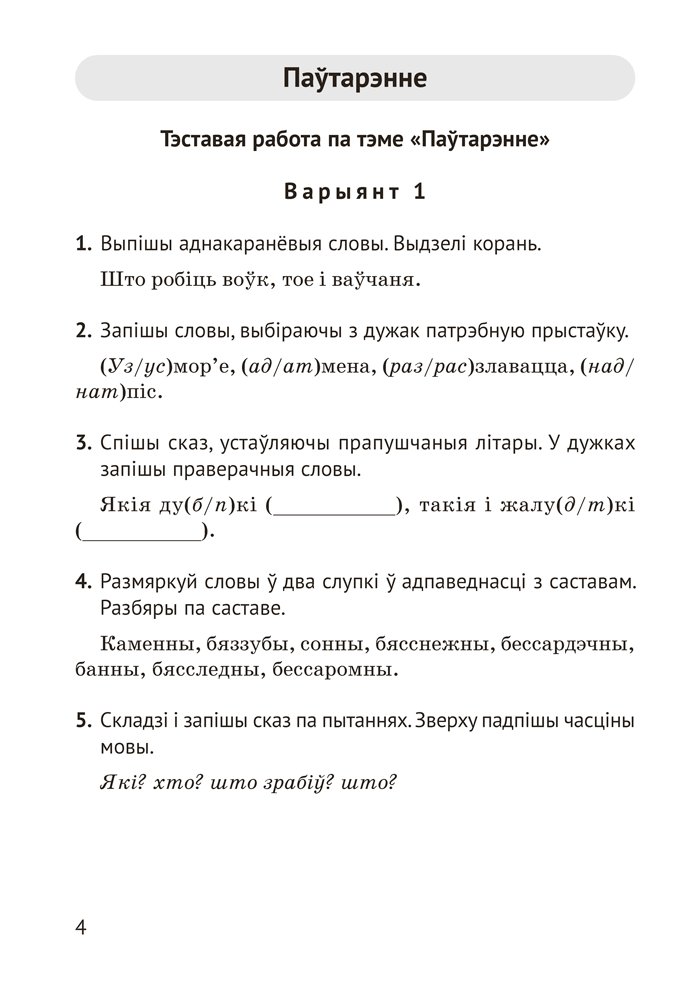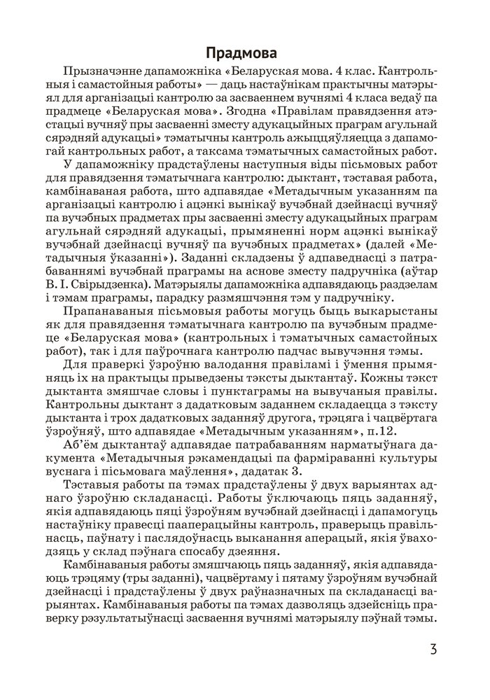 Дапаможнік змяшчае матэрыялы для арганізацыі кантрольна-ацэначнай дзейнасці вучняў 4 класа: тэставыя і камбінаваныя работы, дыктанты. Прапанаваныя заданні могуць быць выкарыстаны для правядзення кантрольных работ або падчас вывучэння тэмы.
