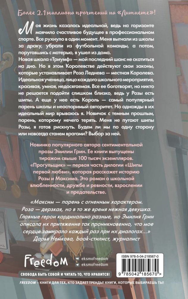 Новинка популярного автора сентиментальной прозы — Эмилии Грин. Ее книги выпущены тиражом свыше 100 тысяч экземпляров. «Прогульщик» — первая часть дилогии «Шипы первой любви», которая расскажет историю Розы и Максима. Роман моментально обрел популярность на портале Литнет, набрав более 2,1 миллиона прочтений, и вошел в топ «Подростковой прозы». Внутри атмосферная верстка, две сюжетных черно-белых иллюстрации, и только в первом тираже в подарок открытка!