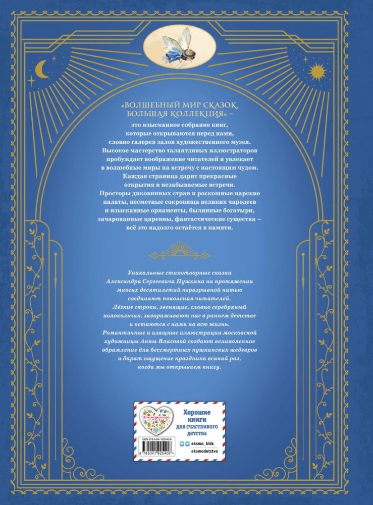 В книгу вошло пять стихотворных сказок А.С. Пушкина – "Сказка о царе Салтане", "Сказка о мёртвой царевне и о семи богатырях", "Сказка и рыбаке и рыбке", "Сказка о золотом петушке", "Сказка о попе и о работнике его Балде". Гениальные произведения великого русского поэта включены в золотой фонд мировой классической литературы. Иллюстрации Анны Власовой.