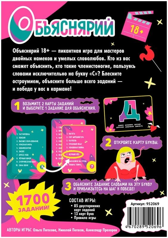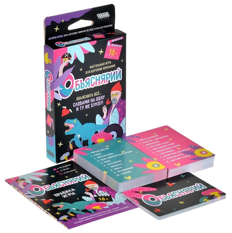 "Объяснярий 18+" – пикантная игра для мастеров двойных намеков и умелых словолюбов. Кто из вас сможет объяснить, кто такие членистоногие, пользуясь словами исключительно на букву "С"? Блесните остроумием, объясните больше всего заданий – и победа у вас в кармане!