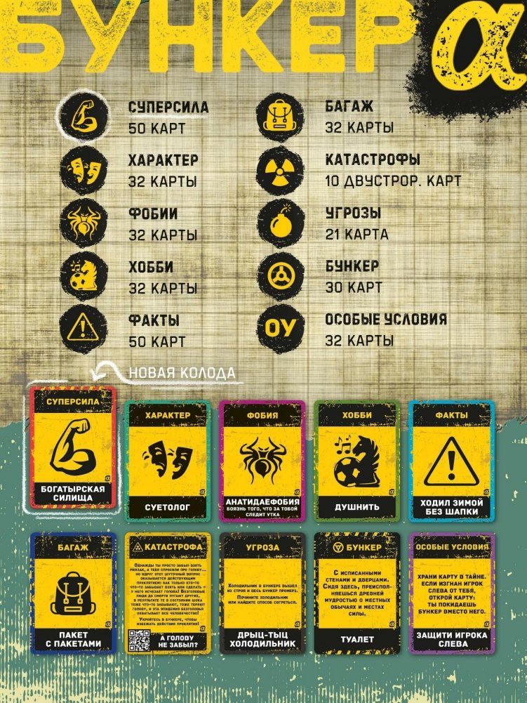 «Бункер: Поколение Альфа» — самостоятельная игра в серии «Бункер». Играйте в «Альфу» отдельно или объедините её с играми «Бункер» и «Бункер—Б», чтобы получить супернабор из почти тысячи карт!