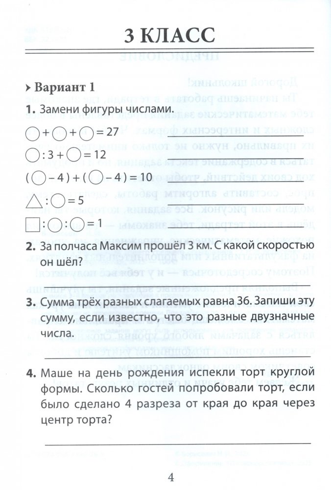 В пособии представлены олимпиадные задания для организации работы с учащимися 3-4 классов по подготовке к предметной олимпиаде по математике: задания с числами, логические задания, текстовые задачи, задачи геометрического содержания, задания на определение времени. Предлагается по 15 вариантов заданий на каждый класс. Все варианты состоят из 10 заданий разного уровня сложности.