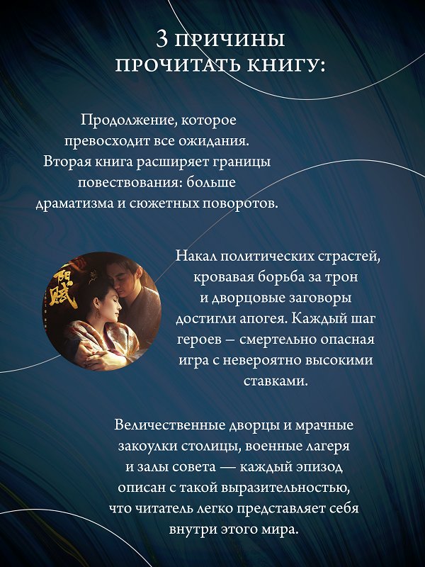 Политические бури не утихают: дворцовые заговоры, борьба за трон и кровопролитные восстания делают каждый шаг смертельно опасной игрой. Но Ван Сюань уже не юная принцесса — она женщина, на чьих плечах держится будущее Поднебесной. Чтобы сохранить порядок, ей приходится принимать жестокие решения, и жертвовать тем, что дорого сердцу. Вместе с Сяо Ци, мужем, ставшим ее опорой и союзником, она проходит через множество опасностей и предательств и поднимается на вершину, чтобы удержать страну от гибели.