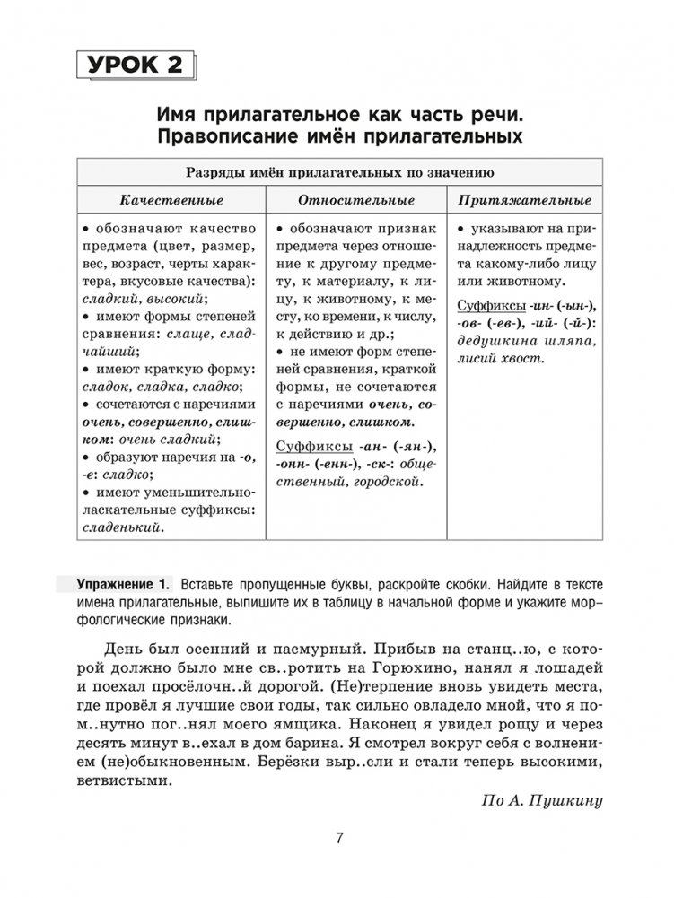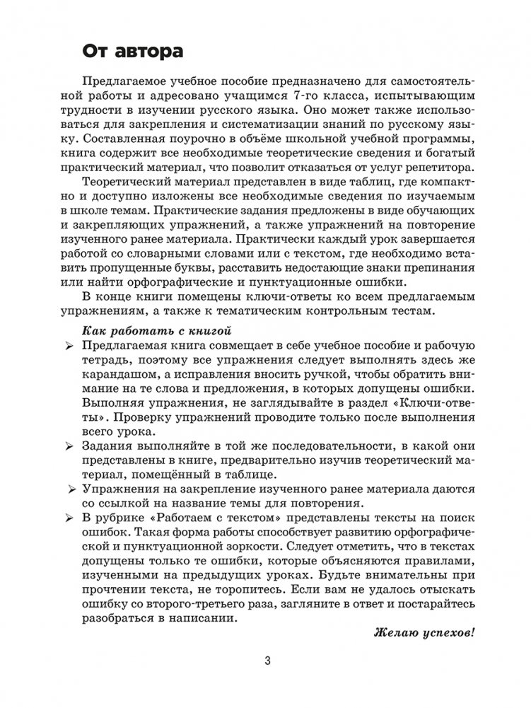 Книга адресована учащимся 7 класса, испытывающим трудности в изучении русского языка. Она составлена так, чтобы ребенок мог сам легко и быстро усвоить материал школьной программы. Пособие содержит все необходимые теоретические сведения и разнообразные практические задания, тем самым совмещая в себе учебное пособие и рабочую тетрадь, поэтому все упражнения можно выполнять прямо в книге. Здесь же приводятся ключи-ответы ко всем упражнениям и тестам. Новая редакция содержит существенные улучшения и дополнения и еще ближе к школьной программе.