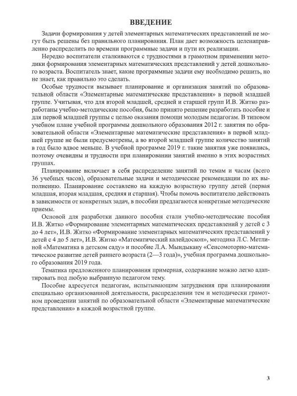 Содержание пособия направлено на реализацию образовательной области "Элементарные математические представления" учебной программы дошкольного образования. Календарно-тематическое планирование составлено на каждую возрастную группу детей и рассчитано на 36 учебных часов, включает в себя распределение занятий по темам и часам, образовательные задачи и методические рекомендации по их выполнению. Тематика предложенного планирования примерная, содержание можно легко адаптировать под любую выбранную педагого тему.