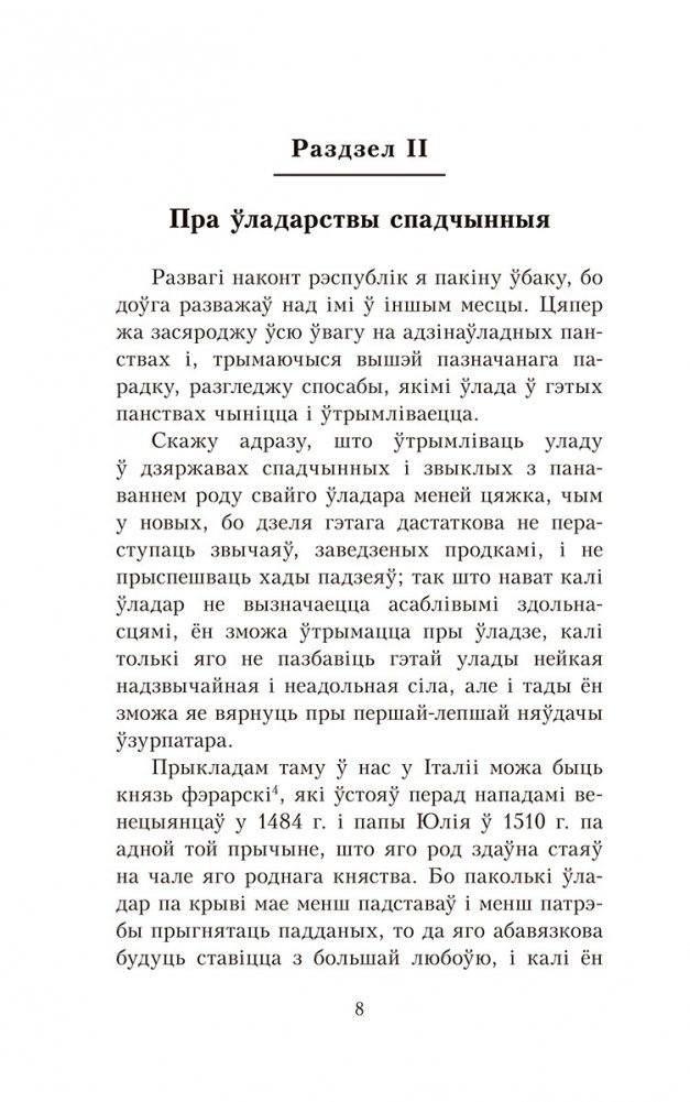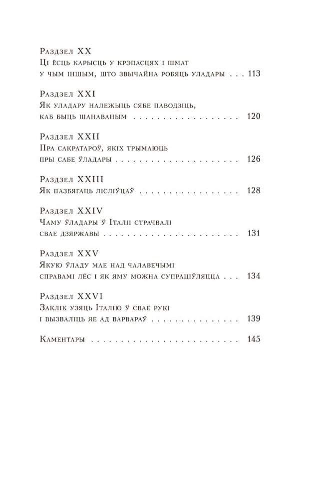 І калі ўжо ўладар павінен умець дзейнічаць па-звярынаму, то лепей за ўсё яму прыпадобніцца да льва і лісіцы, бо, калі ён будзе толькі львом, то не ўратуецца ад пастак, а калі толькі лісіцай, не ўратуецца ад ваўкоў. А значыць, каб распазнаць пасткі, яму трэба быць лісіцай, а каб адпудзіць ваўкоў — ільвом.