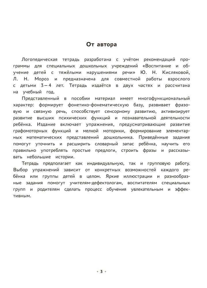 Логопедическая тетрадь предназначена для работы с детьми 3—4 лет. Основная цель пособия — реализация комплексного подхода в коррекции общего недоразвития речи, который осуществляется в тесной взаимосвязи педагогов и родителей воспитанников. Издание способствует выполнению задач программы «Воспитание и обучение детей с тяжёлыми нарушениями речи».