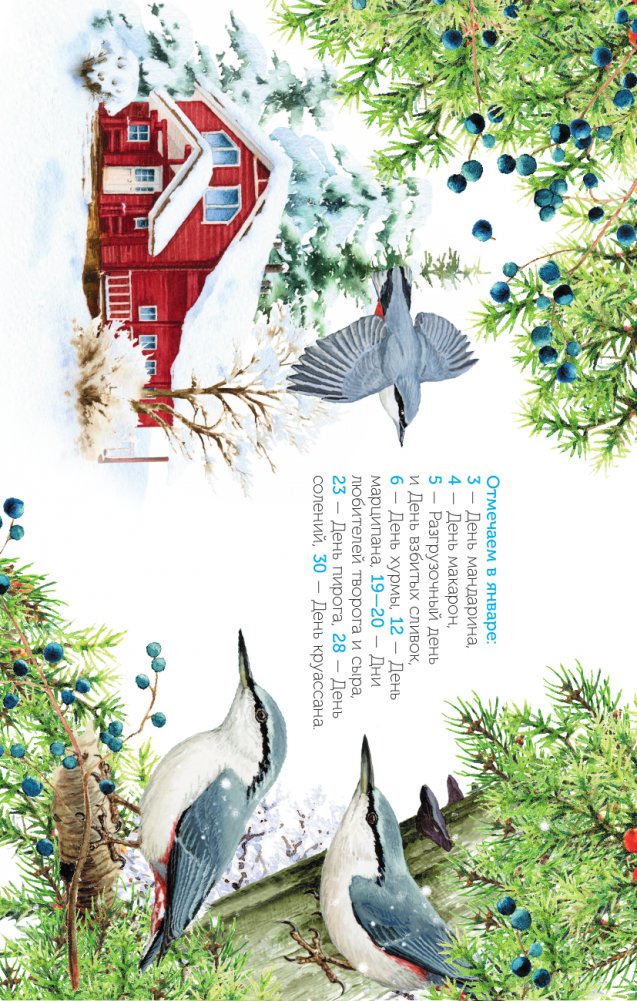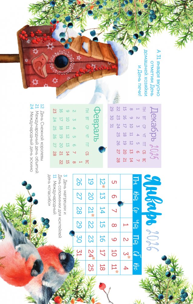 Настольный календарь будет радовать вас целый год не только яркими иллюстрациями, но и вкусными праздниками, которые отмечены в каждом месяце. На каждой странице вы сможете увидеть текущий месяц плюс предыдущий и последующий. Уверены, что такой календарь будет уместен и на рабочем столе, и для дома.