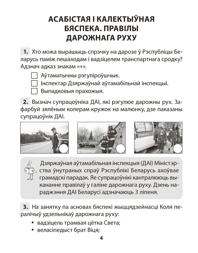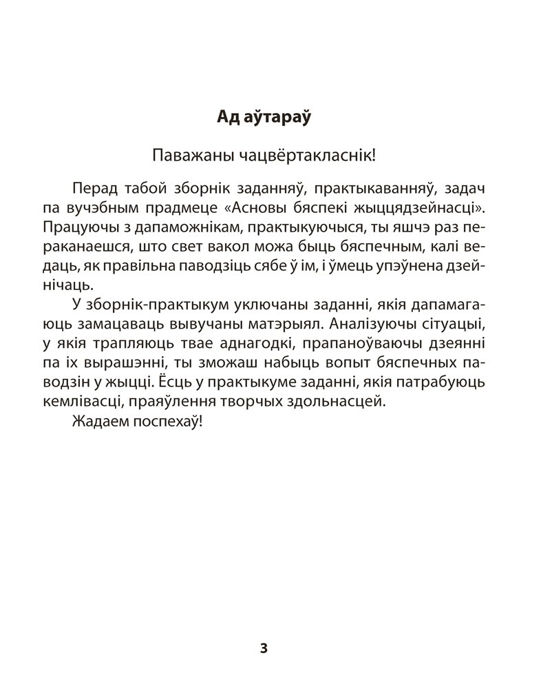 Матэрыял практыкуму адпавядае патрабаванням вучэбнай праграмы па прадмеце «Асновы бяспекі жыццядзейнасці». Заданні распрацаваны з улікам узроставых асаблівасцей вучняў і суправаджаюцца ілюстрацыйным матэрыялам. Работа з дапаможнікам дазволіць сфарміраваць мадэлі бяспечных паводзін ва ўмовах штодзённага жыцця і ў розных небяспечных сітуацыях.