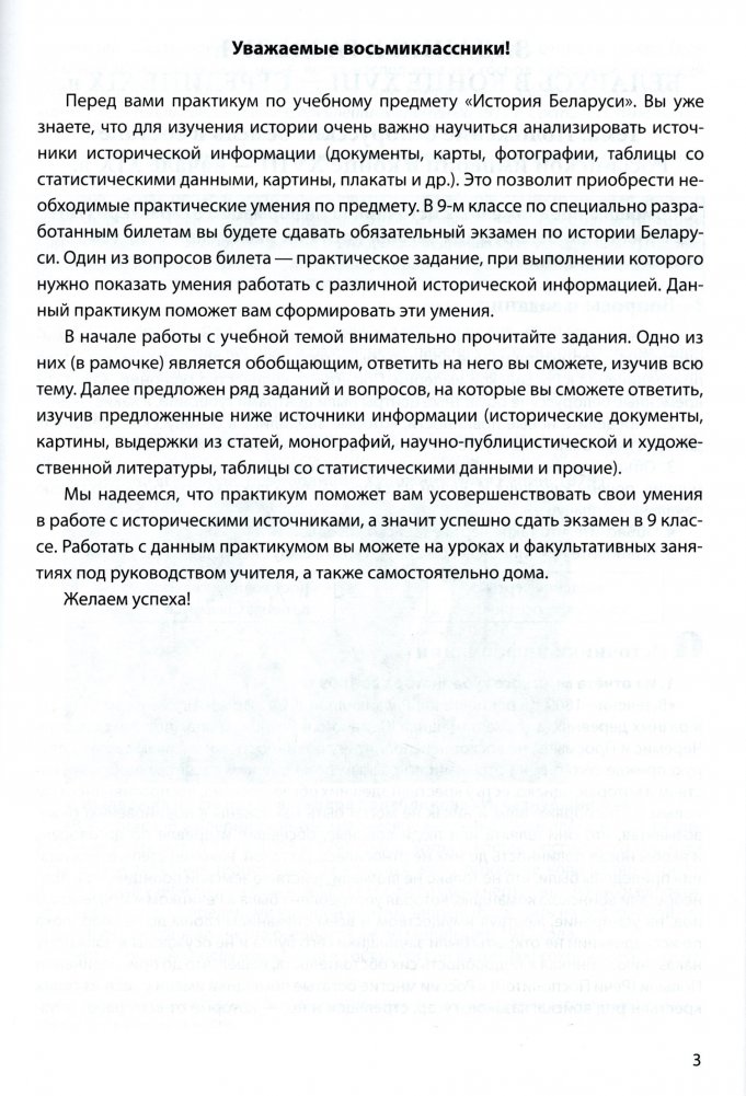 Практикум предназначен для формирования практических умений восьмиклассников при работе с различными историческими источниками. К каждой изучаемой теме предложено несколько исторических источников и ряд заданий. Задания практикума учащиеся могут выполнять на уроках и факультативных занятиях под руководством учителя или в процессе самомтоятельной подготовки. Также практикум поможет подготовиться к успешной сдаче экзамента по истории Беларуси в 9 классе.