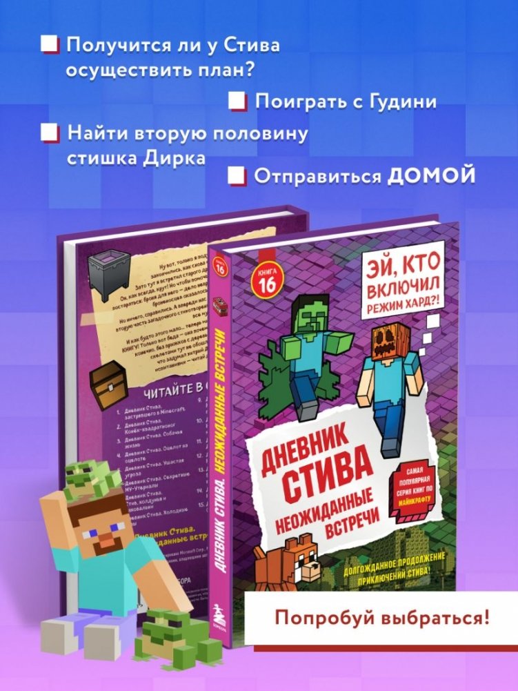 Ну вот, только я подумал, что всё - ФИНИШ, как БАЦ! - и снова в мире МАЙНКРАФТ! Зато тут меня ждал ГУДИНИ! Да-да, тот самый пёс, мой старый верный друг! А дальше всё завертелось: пришлось искать ЩИТЫ от броненосцев (да, это было полное безумие!), найти вторую часть загадочного стихотворения Дирка (ну конечно, опять он всё мутит), и... охота на ЛЕТАЮЩУЮ КНИГУ, которая улетела прямо на ПОЕЗДЕ! Сражения, прыжки, тайны и много-много КРИПЕРОВ. Хочешь узнать, чем всё закончилось? Скорее открывай книгу - скучать тут просто НЕВОЗМОЖНО!