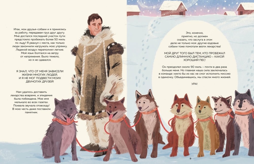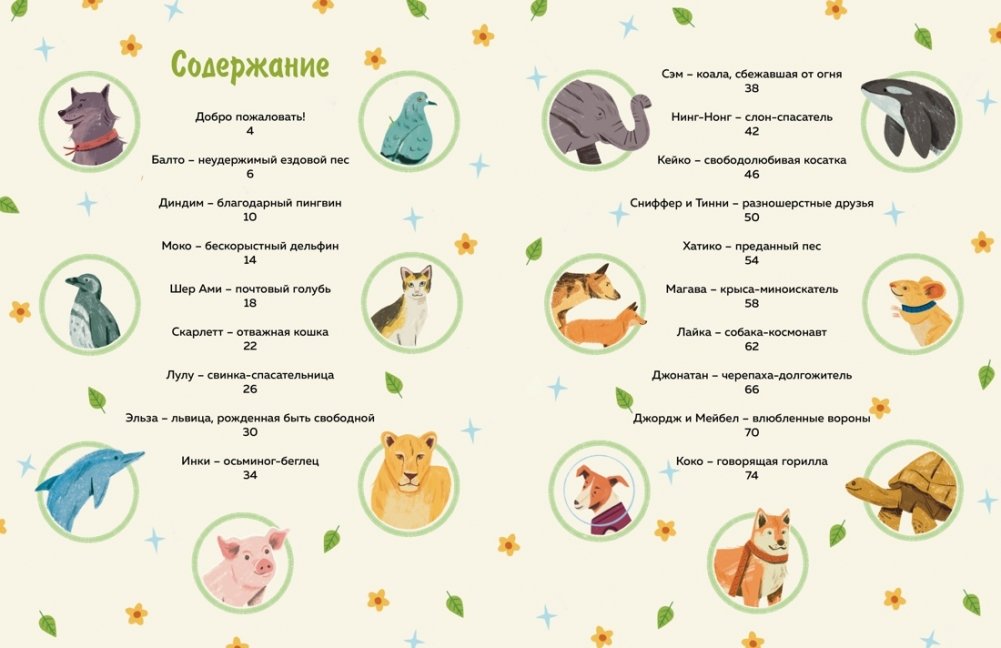 Так, вы узнаете про бесстрашного пса Балто, доставившего лекарства жителям маленького городка на Аляске в период эпидемии, про полет в космос отважной Лайки, о бескорыстном дельфине Моко, который помог двум китам найти дорогу домой, а также о почтовом голубе, спасшем жизни многих людей.