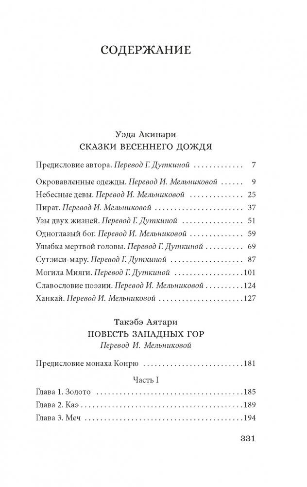 Сборник «Сказки весеннего дождя» Акинари составили новеллы исторического, фантастического и авантюрного характера, а «Повесть Западных гор» Аятари — это история о любви и самурайском долге, основанная на реальных событиях кровавой драмы, разыгравшейся в деревне неподалеку от Киото.