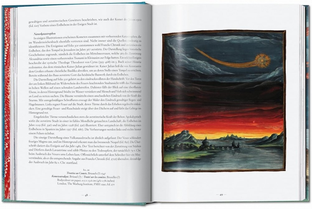 The mesmerizing images deal with both biblical and folkloric tales, depicting stories from the Old Testament and Book of Revelation as well as events that took place in the immediate present of the manuscript’s author. From shooting stars to swarms of locusts, terrifying monsters to fatal floods, page after page hypnotizes with visions alternately dreadful, spectacular, and even apocalyptic.